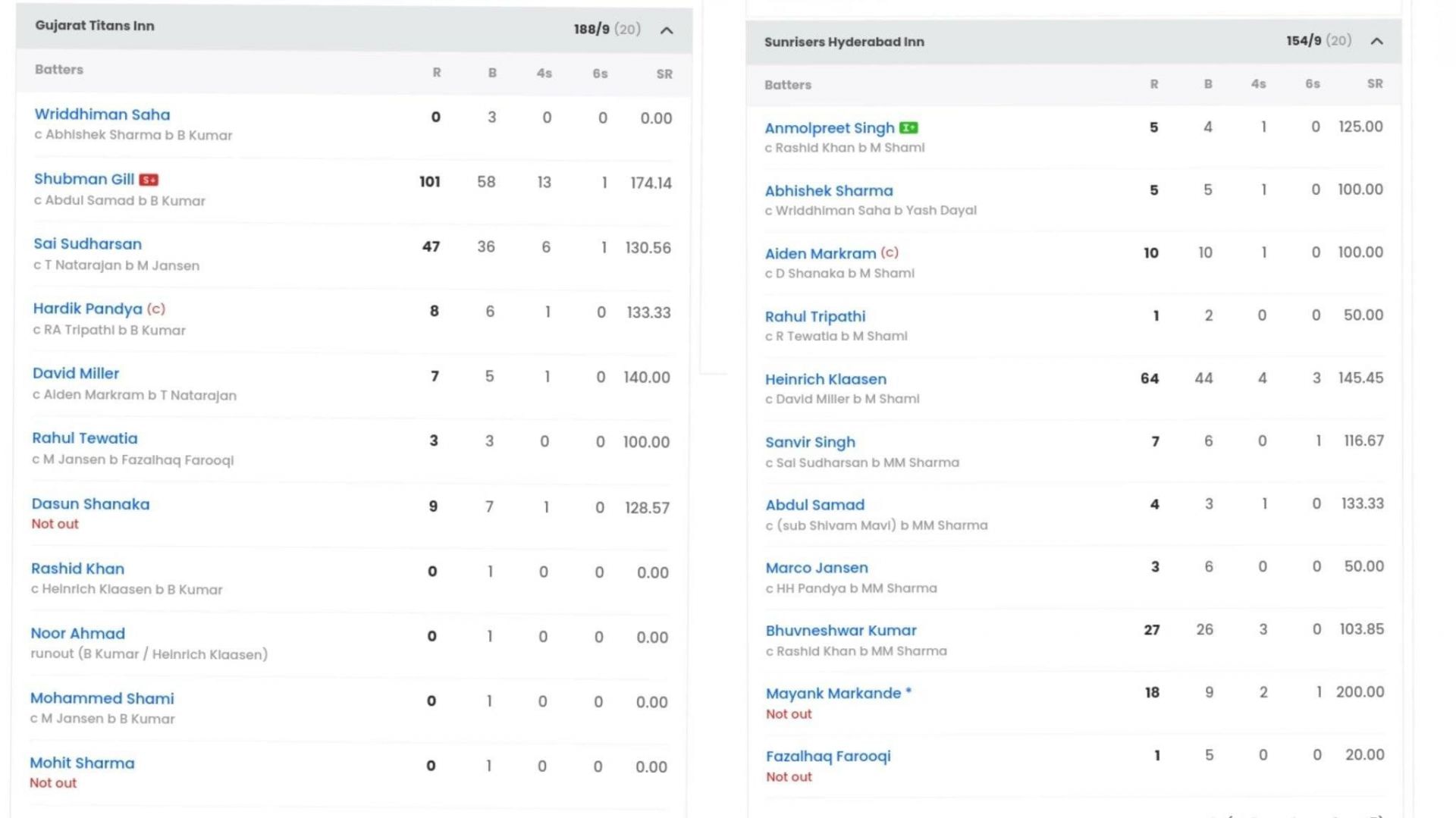 Interestingly, Shubman Gill and Sai Sudharsan were the only two batters to score more than 10 runs for the Gujarat Titans last night. Gill scored a hundred, while Sudharsan scored a valuable 36-ball 47. Bhuvneshwar Kumar bagged a five-wicket haul for the Sunrisers Hyderabad.