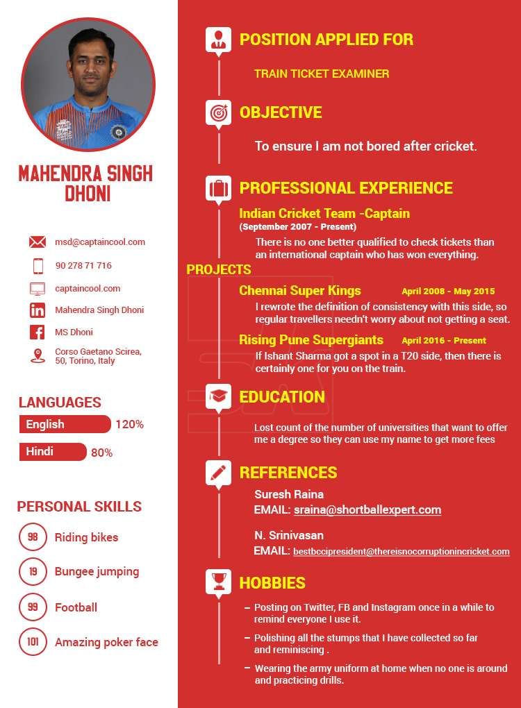 Whenever Dhoni decides to call time on his career, the question of what he will do next is an intriguing one. One wonders if he will go back to where it all began and become a Train Ticket Examiner (TTE). If he does, this is how his post-cricket CV would look like: