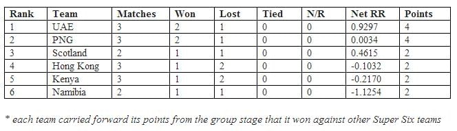 UAE skipper and Mn of the match Khan was thrilled that his team secured victory in such an important match. “That was a very important two points because PNG came into the Super Six stage with four points and most of the other teams came with two points. This stage of the competition you just have to beat every team, and we really respect PNG, they are an awesome team and have been doing very well but our guys did a wonderful job today.”