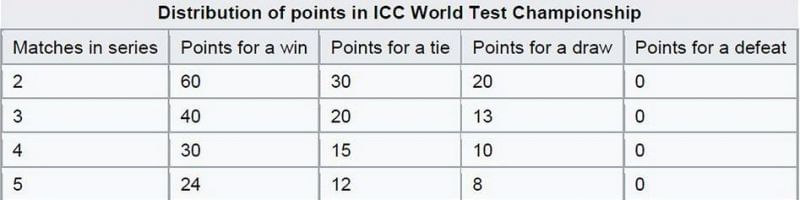 Since all the series' won't consist of the same number of matches, the ICC has tried to make sure that teams who play a lesser number of matches don't get affected by the points system. As a result, points for each series has been capped at 120. In a two-match series, each win will fetch 60 points whereas 20 points will be awarded for each win in case a five-match series is played.