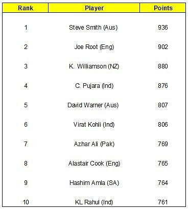 There were no other major movers in the top ten. Steve Smith continues to retain his top spot despite a relatively poor showing against Bangladesh and Joe Root is in second place. Kane Williamson is third with Cheteshwar Pujara leading the flag for Indian batsmen at No.4. Virat Kohli is in sixth place while KL Rahul is still at No.10.