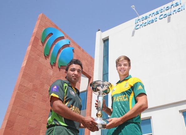 (L-R) Captain of Pakistan Sami Aslam and Captain of South Africa Aiden Markram pose with the trophy ahead of the ICC U19 Cricket World Cup 2014 Final on February 28, 2014 in Dubai, United Arab Emirates.