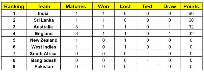 India has taken the top position on the points table because of their massive win over West Indies while Sri Lanka too have the same number of points as India. Australia and England hold the 3rd and 4th positions while New Zealand and West Indies are yet to open their account. South Africa, Bangladesh and Pakistan are yet to play their first game in the Test Championship.