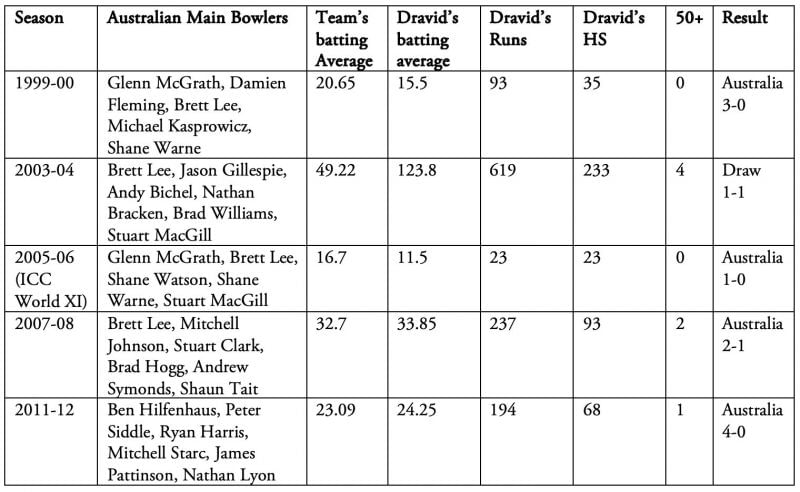 Dravid’s greatest moment in Australia came at The Adelaide Oval. He crafted a fabulous 233 and 72* to guide India to one of its most famous wins. That's 305 runs from one Test. The average almost drops 10 points to 31.89 if that Test is excluded.