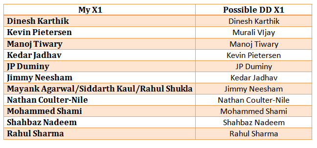 I don’t really think that DD have a weak bowling up, like many do. 5 above average bowlers in Coulter-Nile, Shami, Nadeem, Rahul Sharma and Kaul/Shukla when combined with the part time options of Duminy and Neesham under an astute captain in Pietersen will punch above their weight. The batting order needs to be sorted out, though. The sooner the ‘expected DD 11‘ changes to ‘my DD 11‘, the better and the more exciting it would be.