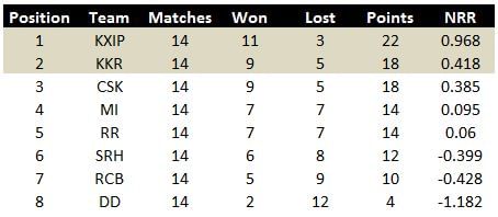 KKR - Gautam Gambhir (c), Robin Uthappa, Manish Pandey, Shakib Al Hassan, Yusuf Pathan, Ryan ten Doeschate, Suryakumar Yadav, Sunil Narine, Piyush Chawla, Morne Morkel, Umesh Yadav