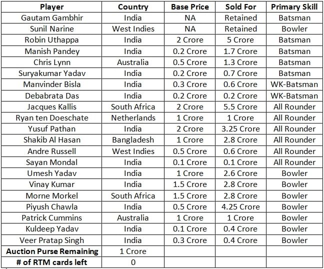 The team will be led by Gautam Gambhir in all likelihood and consists of players like Sunil Narine, Jacques Kallis, Robin Uthappa and many more. Here is the full squad.