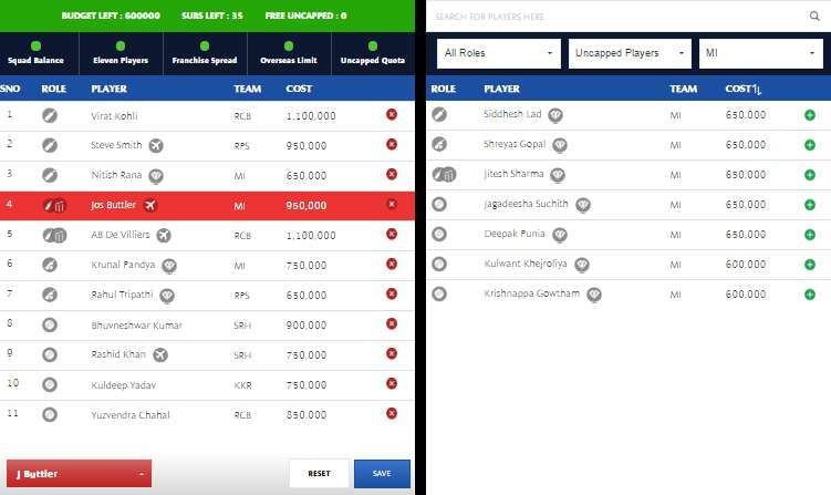 Mumbai Indians are set to take a six-game break after this home encounter, so there is absolutely no need to bring in any more capped players from their team than I already have. With Rohit Sharma, Kieron Pollard and Hardik Pandya batting so low, Jasprit Bumrah and Mitchell McClenaghan are the only players I am missing out on. I expect the pace duo’s impact to be minimised by the in-form, able Supergiant batting unit, though.