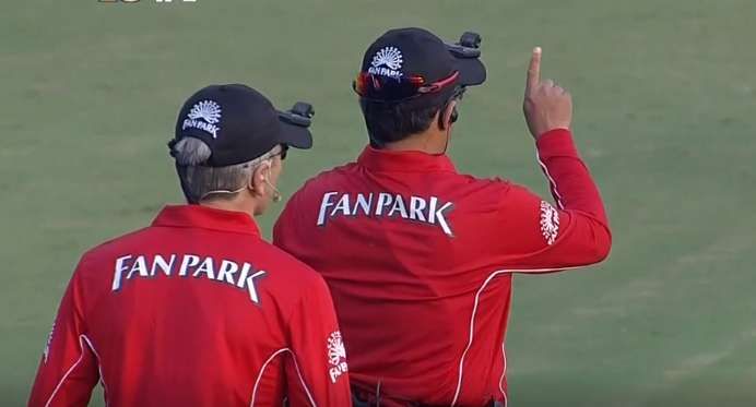 This time the bowler was Ashish Nehra and the batsman seemed to have mistimed his pull shot as the ball ballooned up and Naman Ojha came running forward and took an excellent diving catch. The visitors were convinced but the umpires wanted to go upstairs to check if the ball was caught cleanly and even gave the soft signal as “OUT”.