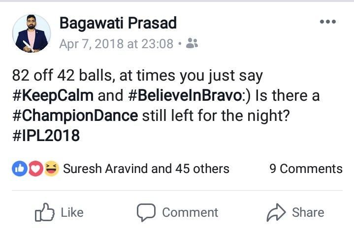 But, deep down in my heart, most CSK fans and I had this feeling of ‘just CSK things’ still left in the game. Despite preparing myself for a Mumbai win for my organisation’s desk, I went on to post: “#KeepCalm and #BeliveInBravo. Is there a #ChampionDance still left for the night?”
