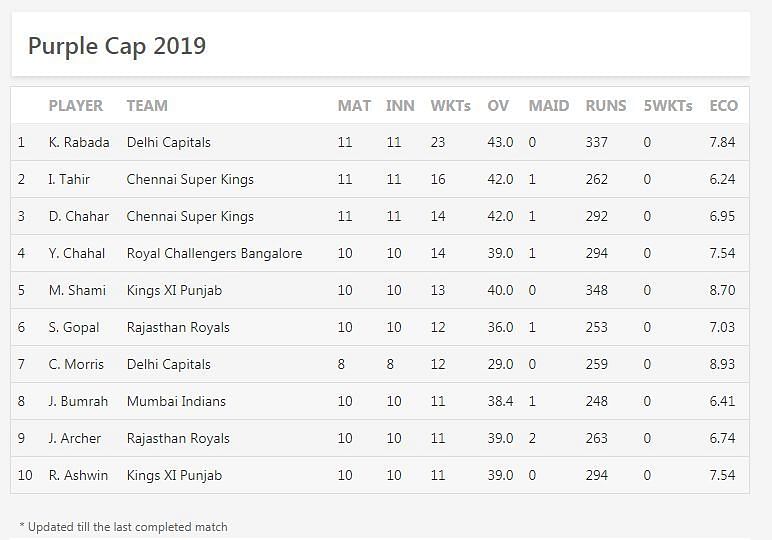 Much like the Orange Cap, the Purple Cap list also has not seen too much of a change as Rabada is still at the top with 23 wickets. He is followed by the two CSK wicket-takers Imran Tahir and Deepak Chahar with 16 and 14 wickets respectively. Sandeep Sharma and Harbhajan Singh climbed up to the 12th and 13th spots after their performance in yesterday's match.