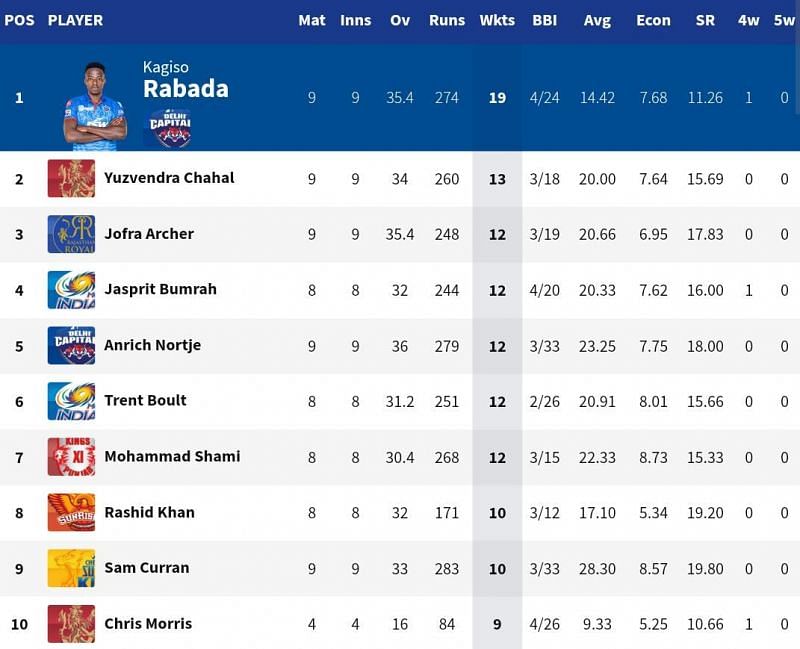 DC speedster Kagiso Rabada extended his lead at the top of the IPL 2020 Purple Cap list after scalping 1 wicket to take his tally to 19 wickets from 9 matches. Yuzvendra Chahal broke into the top 2 after his figures of 2 for 34 took his aggregate to 13 wickets.