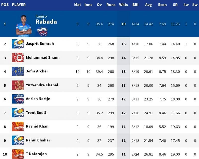 There wasn’t any change on the IPL 2020 Purple Cap list either as Kagiso Rabada remained at the top of the pile having scalped 19 wickets so far in the tournament.