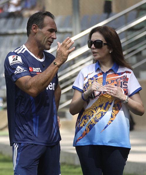 Nita Ambani (R), Mumbai Indians owner, talks with Mumbai Indians mentor Mike Horn during a practice session at Wankhede stadium. As to what she is enlightning him on is a million dollar question.
