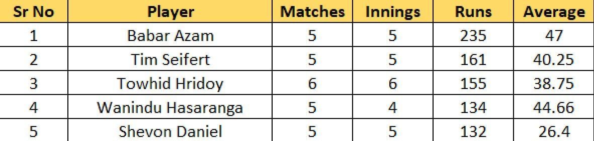 Towhid Hridoy of Jaffna Kings follows Seifert in the most runs list. Hridoy batted lower down the order and remained unbeaten on 14 off nine balls to help his side chase down 147 against the Colombo Strikers. Hridoy has scored 155 runs in six games and averages 38.75 in the tournament.