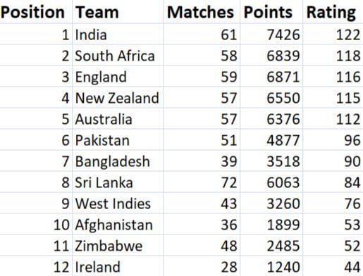 At 116 rating points, England are only two rating points behind South Africa and occupy the third spot in the ODI table. New Zealand (115) and Australia (112) are the only other teams to possess more than 100 rating points.