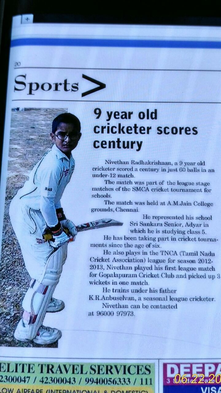 Nivethan started to make headlines in 2011 when he took a hat-trick in a TNCA fourth division league match in spite of being just eight years old. A year later, he scored a century off just 60 balls in an under-12 match. These were clear indications that cricket was in his blood. He took up the sport after seeing his father play and now, is making his dad proud.