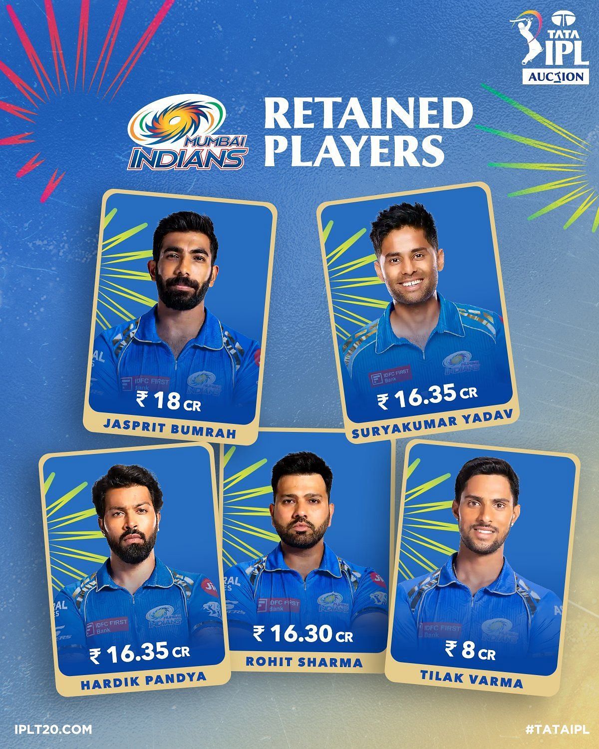 Mumbai Indians have retained Jaspreet Bumrah, Suryakumar Yadav, Hardik Pandya, Rohit Sharma, and Tilak Verma.