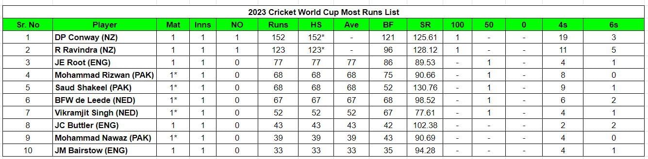 The two centurions from the first day of the 2023 World Cup, Devon Conway and Rachin Ravindra, are sitting at the top of the list of batsmen with the most runs in the tournament so far. Conway made 152 runs, while Ravindra made 123 runs.