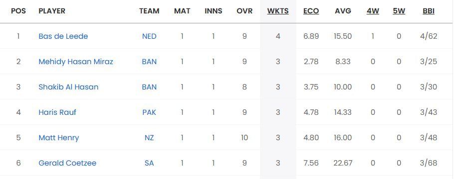 Bas de Leede remains the top wicket-taker of the World Cup 2023. The right-handed medium pacer has picked up four wickets at an economy rate of 6.88. Mehidy Hasan Miraz, Shakib Al Hasan, Haris Rauf, Matt Henry and Gerald Coetzee have three wickets apiece to their names.