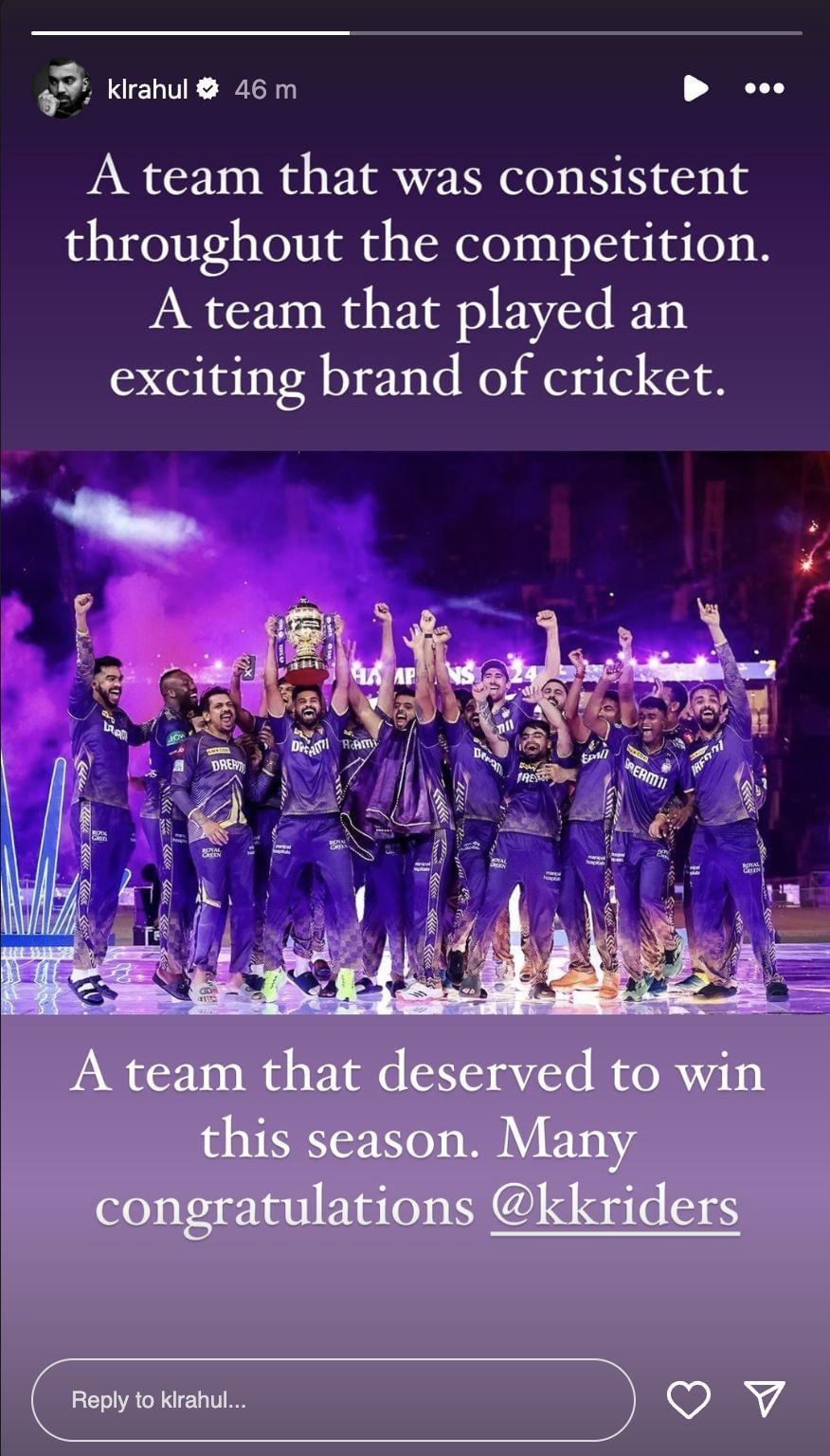 Congratulatory messages poured in worldwide after KKR capped off a brilliant campaign by lifting their third IPL trophy. KL Rahul also joined the bandwagon to congratulate Shreyas Iyer and company for their emphatic victory.