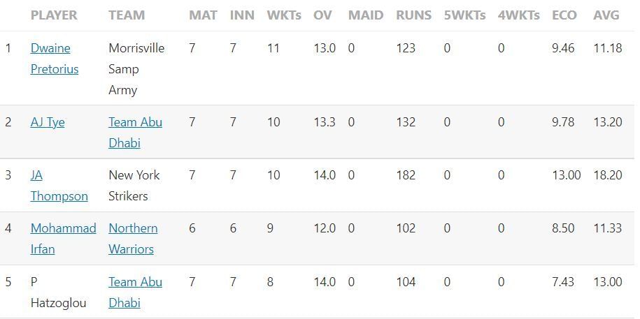 New York Strikers’ Eoin Morgan has climbed up to the fourth spot with 205 runs at an average of 41. He could contribute 15 runs off 15 balls versus Team Abu Dhabi. Underdogs' contributions today from James Vince and Chris Lynn of Team Abu Dhabi have not witnessed a big change in their positions as they have only swapped their places on the table.