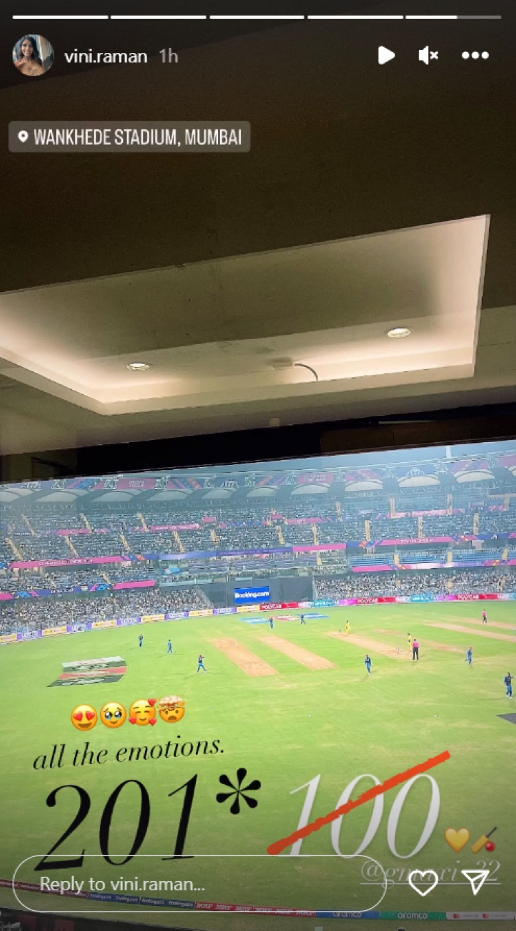 Vini Raman appreciated Maxwell's magnificent knock against Afghanistan by sharing a picture in her Instagram story embedded with several emojis. She wrote: