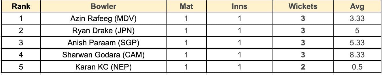 The Maldives medium pacer is leading the wickets column, scalping three wickets over Mongolia. Japan pacer Drake occupied the second spot, racking up three scalps. Singapore's Anish Paraam settled with the third rank, bagging three wickets at an average of 5.33.
