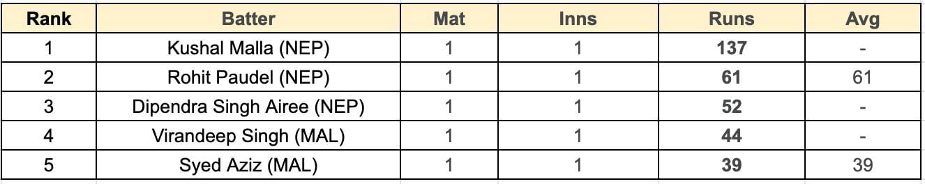 Nepal batter Kushal Malla is the leading run-scorer after his historic 137-run unbeaten knock over Mongolia. His colleague Rohit Paudel occupies the second rank, accumulating 61 runs over the same opposition.