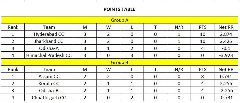 Meanwhile, Odisha B are in the third slot with four points. Chhattisgarh CC settled with the wooden spoon, losing both games so far.