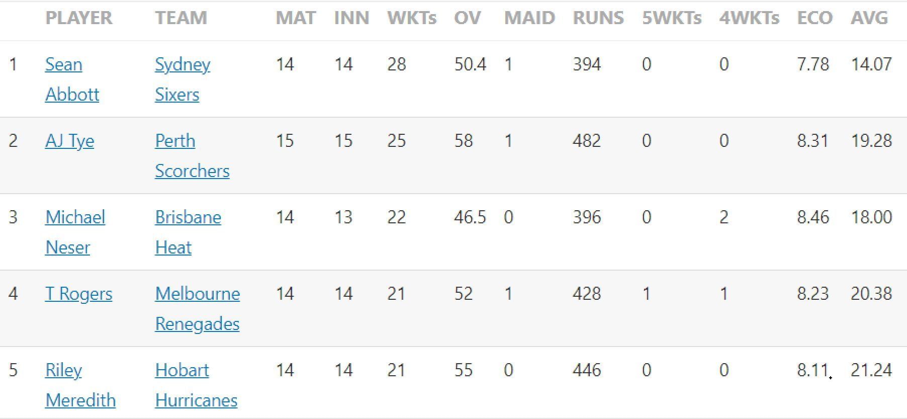 Andrew Tye of the Perth Scorchers was on top of the table for quite some time before being displaced by Abbott. In 15 matches, Tye has picked up 25 wickets from 15 matches at an economy rate of 8.31. Michael Neser of Brisbane and Thomas Rogers of the Melbourne Renegades have also been excellent.
