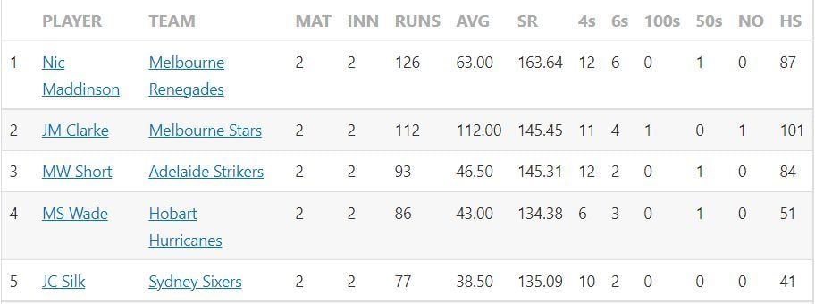 Meanwhile, Nic Maddinson is still at the top of the most run-getters' list with 126 runs from two games at a strike rate of 163.64. He is followed by Joe Clarke in the list, who has 112 runs to his name from as many games.