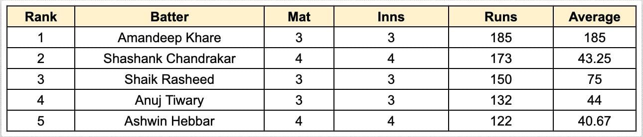Chhattisgarh Blue captain Amandeep Khare is the new leading run-scorer with 185 runs from three innings at an average of 185 and a strike rate of 146.83. Chhattisgarh Red batter Shashank Chandraker secured the second rank, amassing 173 runs from four matches at an average of 43.25.