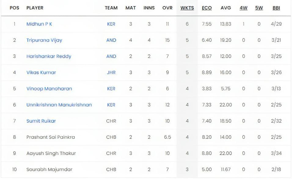 Midhun P K is still the leading wicket-taker. He has taken six wickets in three games at an average of 13.83, an economy of 7.55, and a strike rate of 11.