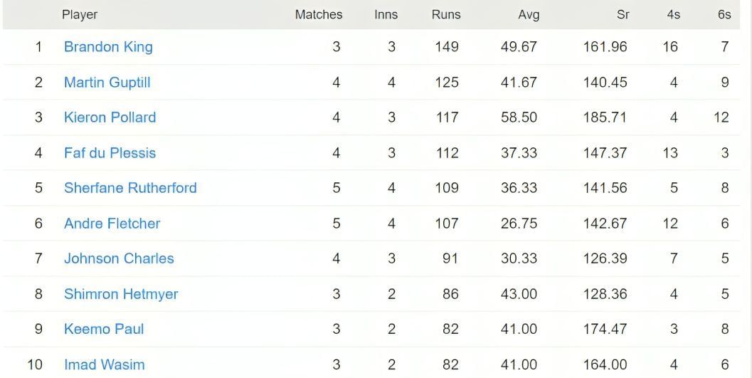 Brandon King has currently cemented his place at the top with 149 runs to his tally. He has been in impressive form in this tournament and has smashed 16 fours and 7 sixes batting at a scintillating strike rate of 161.95. He currently averages 49.66 at present and has notched up two half-century scores already.