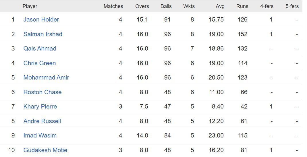 Roston Chase slips to the fourth spot in the wickets chart with 6 wickets in 4 matches. The off-spin bowling all-rounder averages only 11 and has bagged his best figures of 3/39 so far in the tournament. Besides, his strike rate stands at a jaw-dropping low of 8 while his economy rate is around 8.25 RPO.