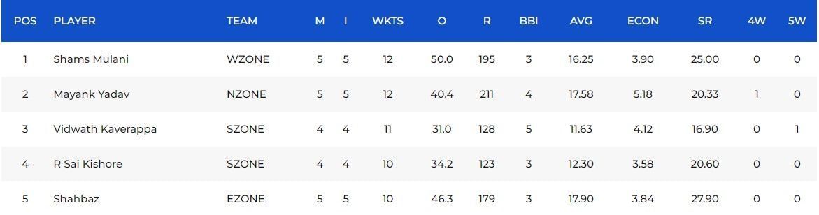 Deodhar Trophy 2023 Most Wickets List