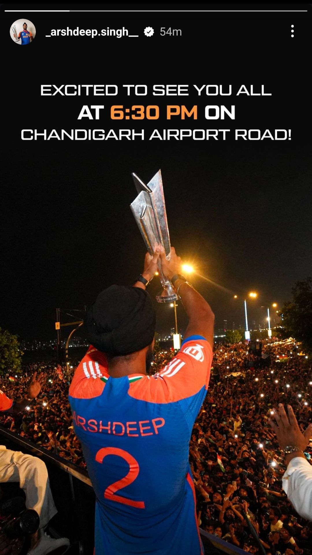 Indian player Arshdeep Singh is excited to meet his fans in Chandigarh after winning the 2024 T20 World Cup. A victory parade has been organized in the city for the left-arm pacer.