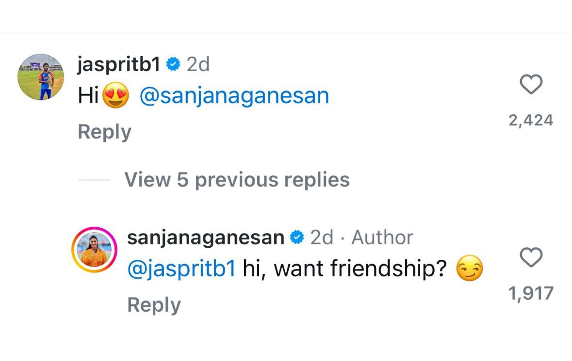 Sanjana responded to Bumrah's comment cheekily, writing: