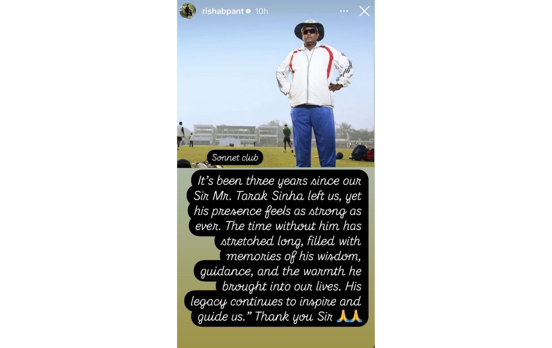 On the veteran coach's death anniversary, Pant posted a note on his Instagram story. Mentioning that Sinha's legacy continues to be an inspiration for him, the 27-year-old wrote: