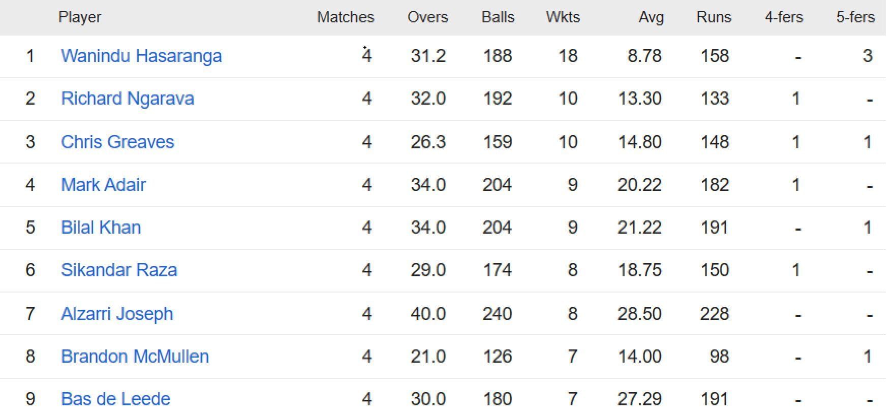 Zimbabwean fast bowler Richard Ngarava is second on the list with 10 wickets from four matches at an average of 13.30. Chris Greaves, Mark Adair, Bilal Khan, Sikandar Raza and Brandon McMullen have also been impressive.