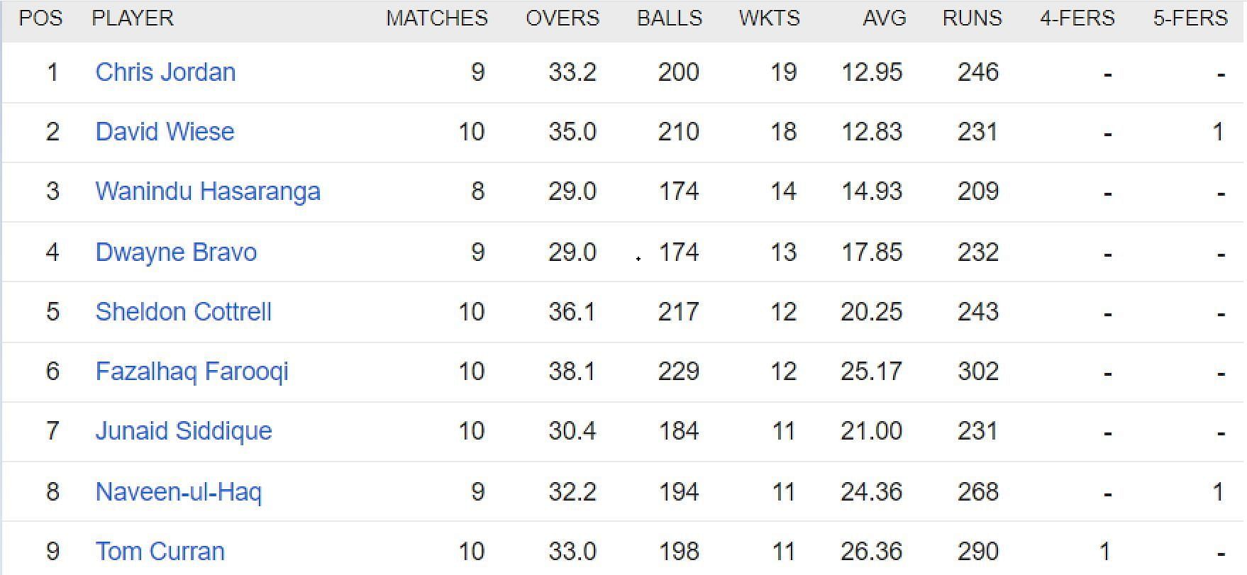 David Wiese of the Giants has also been impressive, with the fast bowler picking up 18 wickets in ten games at an economy rate of 6.60 and a five-wicket haul to his name. Wanindhu Hasaranga, Dwayne Bravo and Sheldon Cottrell have also been impressive.
