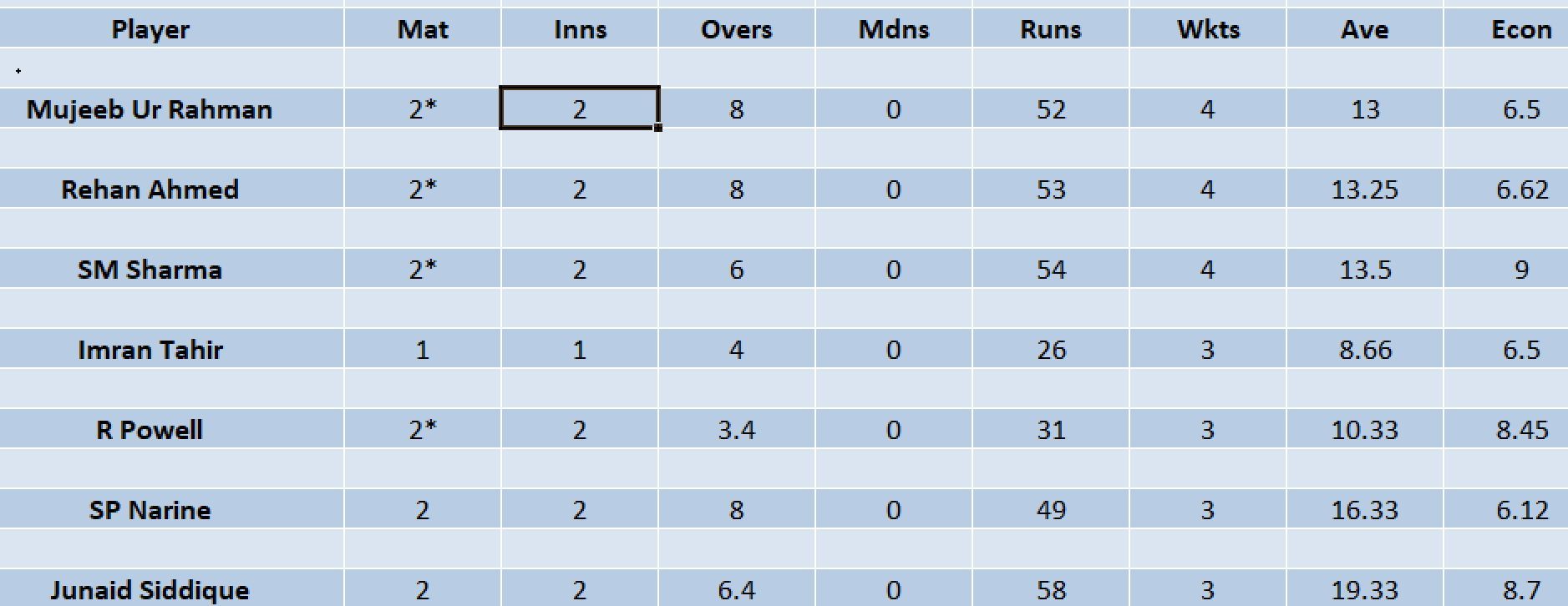 Capitals spinner Mujeeb Ur Rahman is the leading wicket-taker of the tournament. The off-spinner has picked up four wickets at an economy rate of 6.50. Giants' bowlers Rehan Ahmed and Sanchit Sharma also have four wickets apiece but Mujeeb has bowled at a better average of 13 compared to the other two.