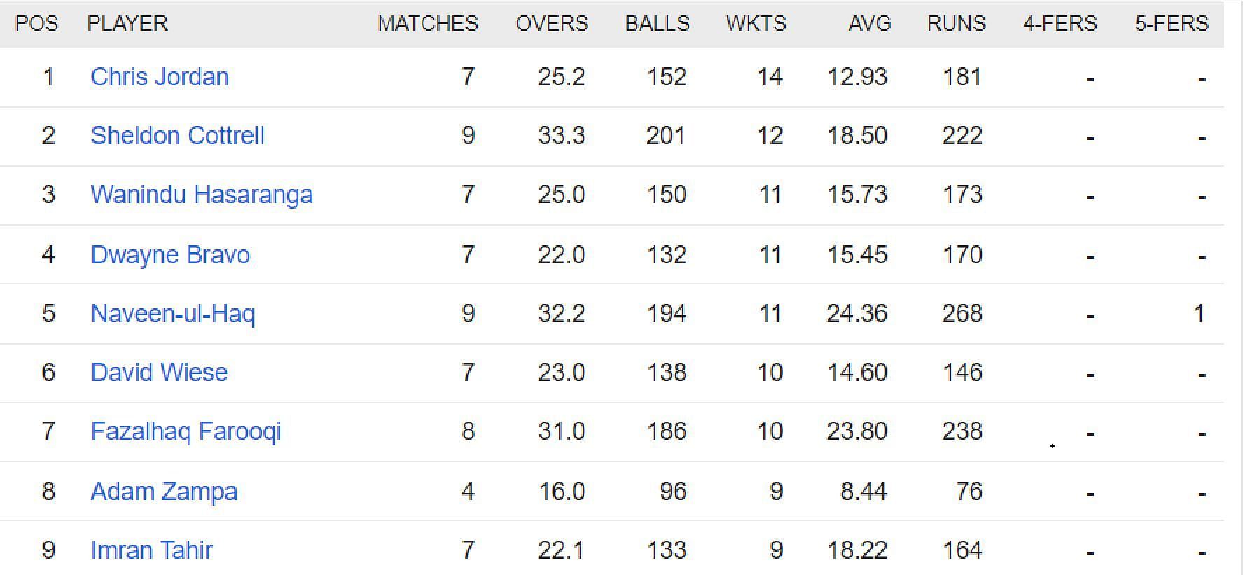 Sheldon Cottrell of the Desert Vipers hasn’t disappointed either. The left-arm fast bowler is second on the list with 12 wickets from nine matches at an economy rate of 6.62. Dwayne Bravo, Wanindu Hasaranga, Naveen-ul-Haq, David Wiese, and Adam Zampa have also been impressive.