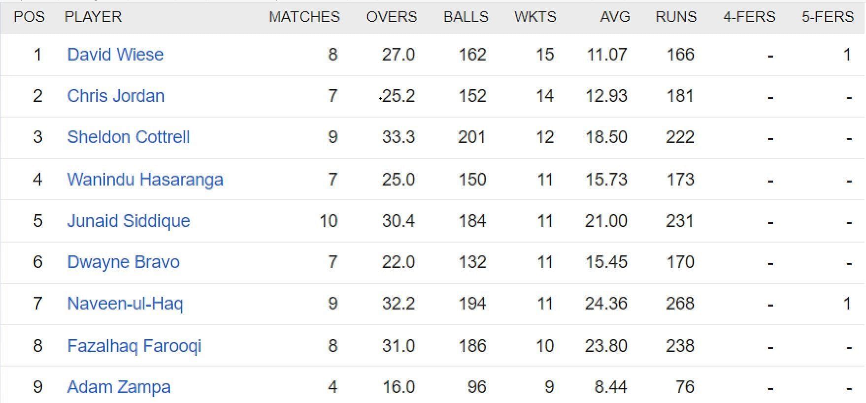 Left-arm fast bowler Sheldon Cottrell picked up 12 wickets at an average of 18.50. Leg-spinner Wanindu Hasaranga, Junaid Siddiqui, veteran speedster Dwayne Bravo, and Afghani fast bowler Naveen-ul-Haq finished the International League group stage with 11 wickets apiece.