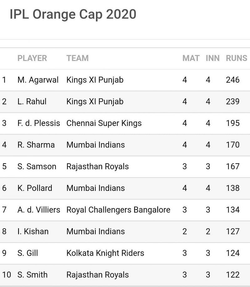 There was no further change on the IPL 2020 leading run-getters list as the Kings XI Punjab duo of Mayank Agarwal and KL Rahul occupy the top two slots with aggregates of 246 runs and 239 runs respectively.