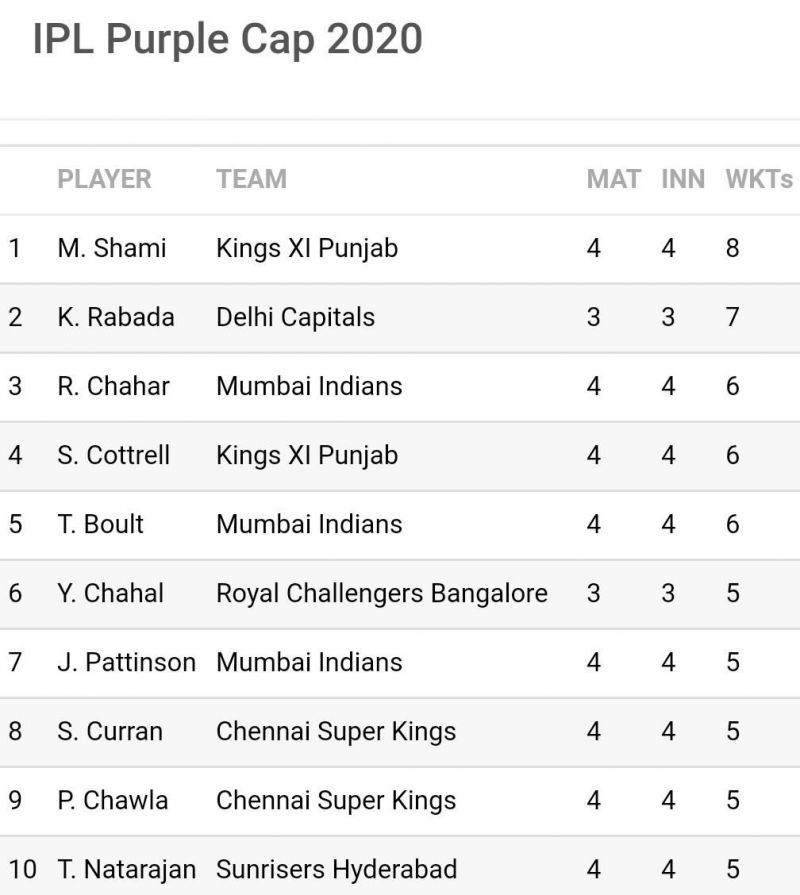 CSK all-rounder Sam Curran, who at one time was the holder of the Purple Cap, is eighth in the table, also having picked up five wickets from four games.