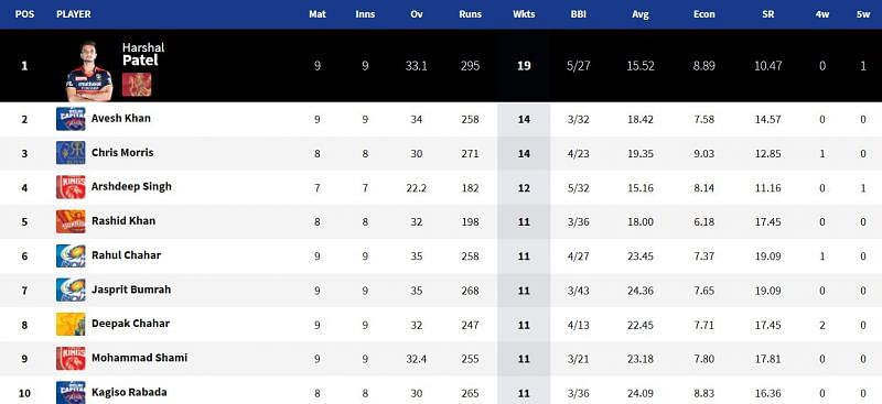 IPL 2021 Purple Cap holder Harshal Patel retained the top spot, adding two wickets to his tally. Patel dismissed the duo of Moeen Ali and Ambati Rayudu in the match against CSK.