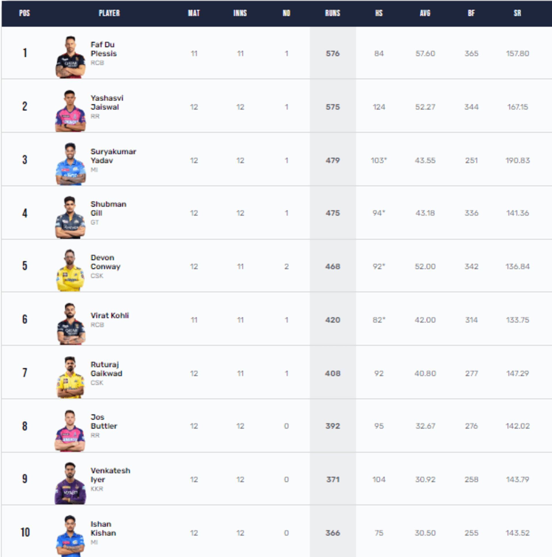 Suryakumar Yadav continued from where he left off against the Royal Challengers Bangalore (RCB) in the previous encounter and went on to record his maiden IPL ton. The in-form batter finished with an unbeaten 103 off just 49 deliveries and is now ranked third on the Orange Cap list with 479 runs for the season.