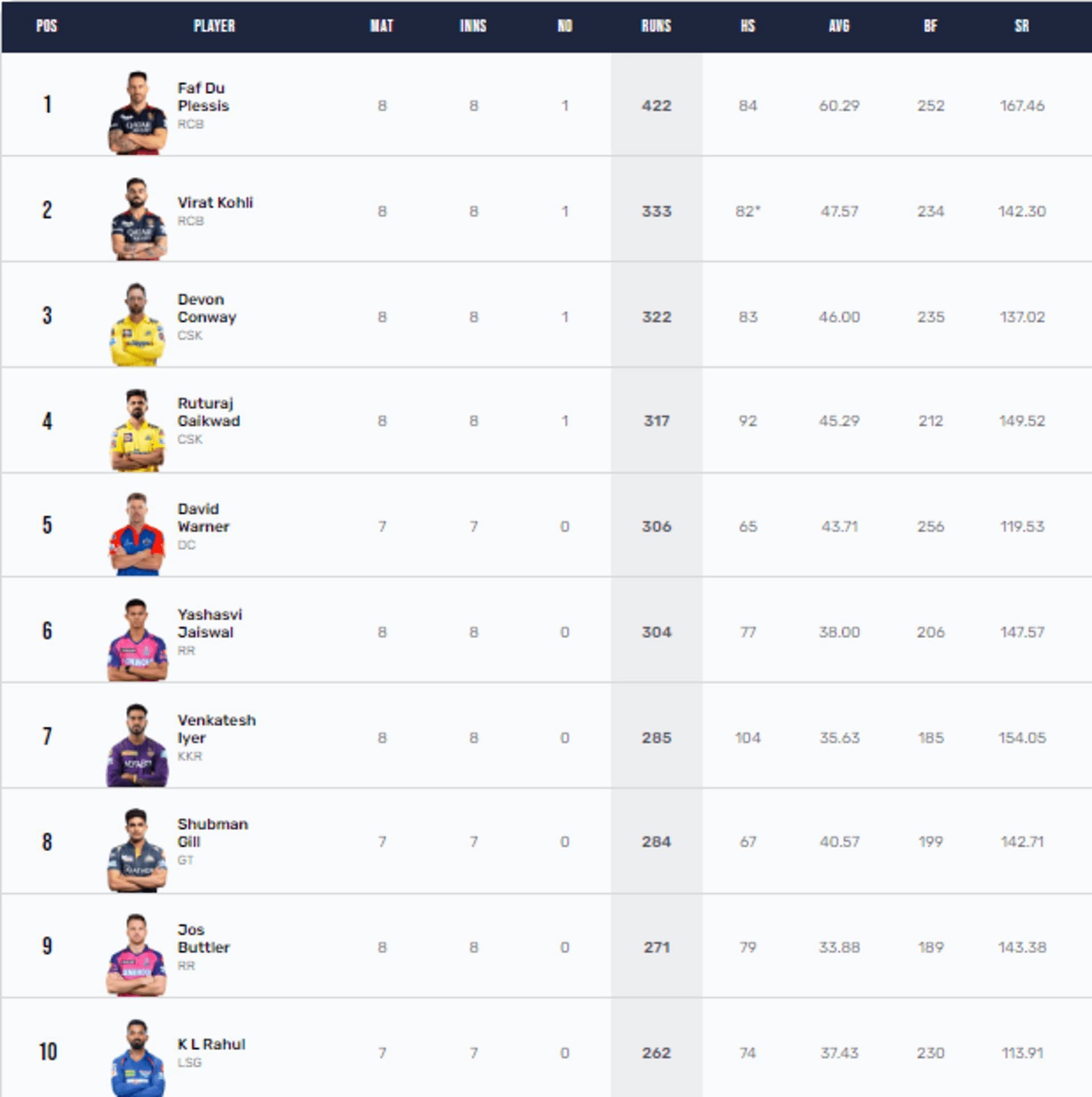 Devon Conway's string of fifties came to an abrupt end after a tame innings during the run chase. The opening batter scored eight runs off 16 deliveries at a strike rate of 50. He has 322 runs in eight matches at a strike rate of 137.02. He is placed third on the run charts behind the RCB duo of Faf du Plessis and Virat Kohli.
